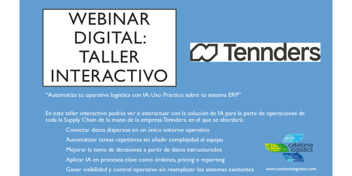 El 30 d'abril, en aquest tercer taller pràctic titulat “Automatitza la teva operativa logística amb IA: Ús pràctic amb el teu sistema ERP”, explorarem de la mà de Tennders, la seva solució d'intel·ligència artificial per millorar l'operativa logística.