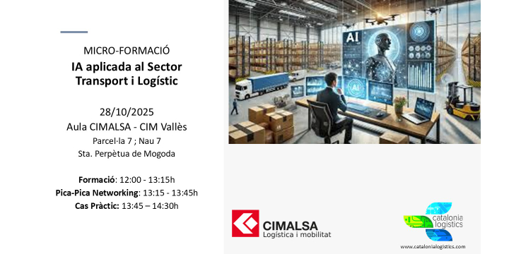 El 28 d'OCTUBRE, el Cluster Catalonia Logistics i CIMALSA hem preparat la següent MICRO-FORMACIÓ gratuïta: IA APLICADA AL SECTOR TRANSPORT I LOGÍSTIC en horari de 12h a 14h30 en la CIM VALLÈS.